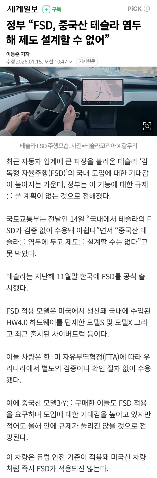 정부 “테슬라 FSD 규제 풀 계획 없어” 작성자 정보 크크크 작성 작성일 2026.01.16 11:08 컨텐츠 정보 437 조회 목록 본문 정부 “테슬라 FSD 규제 풀 계획 없어” 관련자료 댓글 0 등록된 댓글이 없습니다. 로그인한 회원만 댓글 등록이 가능합니다. 목록