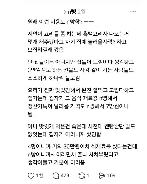 집에서 요리해준다고 부르더니 재료비 n빵하자는 지인 작성자 정보 GG요 작성 작성일 2026.01.29 12:22 컨텐츠 정보 187 조회 목록 본문 집에서 요리해준다고 부르더니 재료비 n빵하자는 지인 관련자료 댓글 0 등록된 댓글이 없습니다. 로그인한 회원만 댓글 등록이 가능합니다. 목록