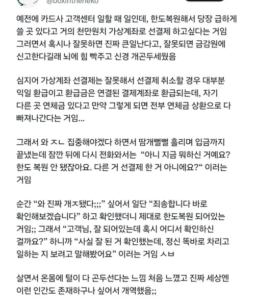 무너진 인간성을 느꼈던 카드사 상담원 작성자 정보 GG요 작성 작성일 2026.02.01 12:07 컨텐츠 정보 869 조회 목록 본문 무너진 인간성을 느꼈던 카드사 상담원 관련자료 댓글 0 등록된 댓글이 없습니다. 로그인한 회원만 댓글 등록이 가능합니다. 목록