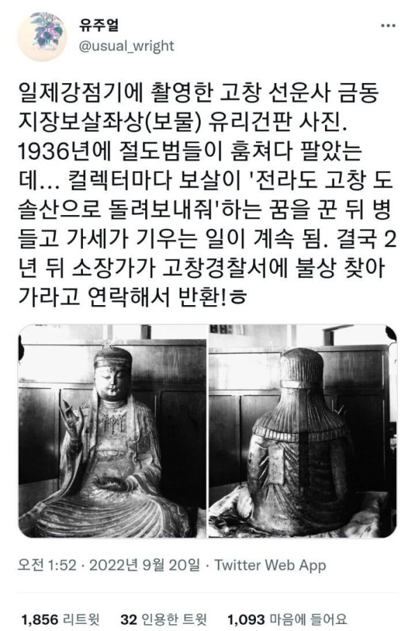 도난 당한 불상이 다시 돌아온 이유 작성자 정보 맥너겟 작성 작성일 2026.02.03 13:10 컨텐츠 정보 162 조회 목록 본문 도난 당한 불상이 다시 돌아온 이유 관련자료 댓글 0 등록된 댓글이 없습니다. 로그인한 회원만 댓글 등록이 가능합니다. 목록