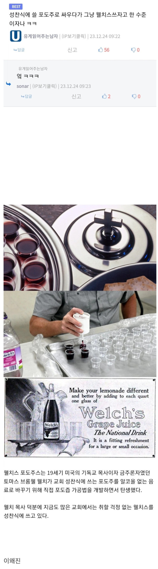 교회에서 포도주 대신 웰치스 써도 됨? 작성자 정보 개죽이 작성 작성일 2026.02.03 13:10 컨텐츠 정보 137 조회 목록 본문 교회에서 포도주 대신 웰치스 써도 됨? 관련자료 댓글 0 등록된 댓글이 없습니다. 로그인한 회원만 댓글 등록이 가능합니다. 목록