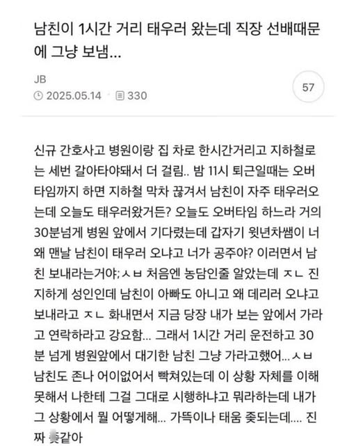간호사가 1시간 거리 태우러와서 30분 기다린 남친을 그냥 보낸 이유 작성자 정보 GG요 작성 작성일 2026.02.22 12:29 컨텐츠 정보 511 조회 목록 본문 간호사가 1시간 거리 태우러와서 30분 기다린 남친을 그냥 보낸 이유 관련자료 댓글 0 등록된 댓글이 없습니다. 로그인한 회원만 댓글 등록이 가능합니다. 목록