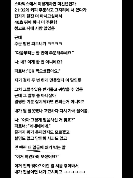 스타벅스에서 겪은 황당한 일 작성자 정보 GG요 작성 작성일 2026.02.23 13:00 컨텐츠 정보 597 조회 목록 본문 스타벅스에서 겪은 황당한 일 관련자료 댓글 0 등록된 댓글이 없습니다. 로그인한 회원만 댓글 등록이 가능합니다. 목록