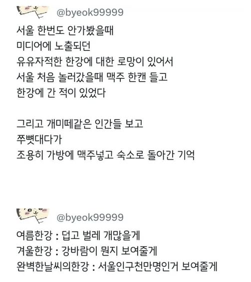 한강에 대한 지역민과 지방민의 차이 작성자 정보 GG요 작성 작성일 2026.02.28 12:27 컨텐츠 정보 10,627 조회 목록 본문 한강에 대한 지역민과 지방민의 차이 관련자료 댓글 0 등록된 댓글이 없습니다. 로그인한 회원만 댓글 등록이 가능합니다. 목록