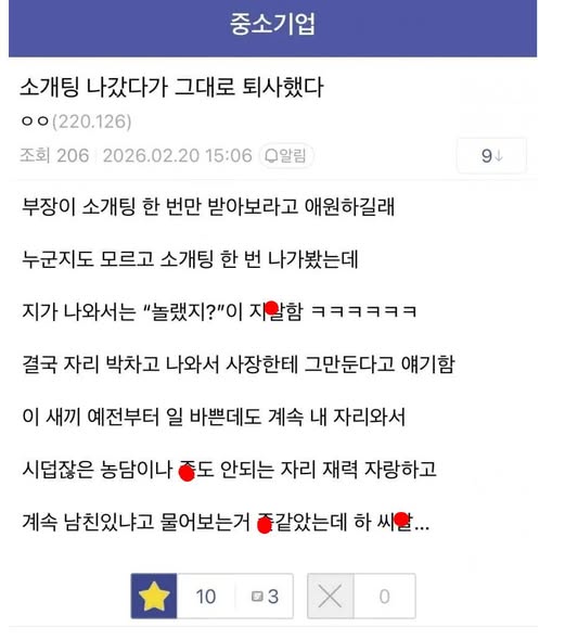 ??? : 소개팅 나갔다가 그대로 퇴사헀다 작성자 정보 GG요 작성 작성일 2026.03.02 13:02 컨텐츠 정보 9,590 조회 목록 본문 ??? : 소개팅 나갔다가 그대로 퇴사헀다 관련자료 댓글 0 등록된 댓글이 없습니다. 로그인한 회원만 댓글 등록이 가능합니다. 목록