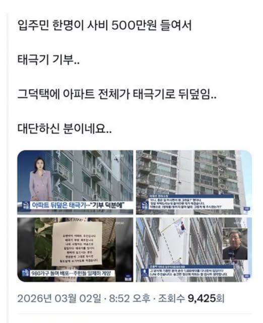 입주민 한명이 사비 털어서 기부 작성자 정보 GG요 작성 작성일 2026.03.04 13:10 컨텐츠 정보 8,359 조회 목록 본문 입주민 한명이 사비 털어서 기부 관련자료 댓글 0 등록된 댓글이 없습니다. 로그인한 회원만 댓글 등록이 가능합니다. 목록