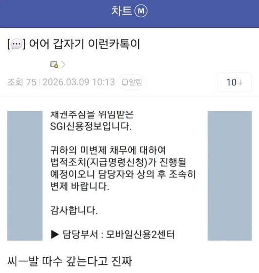 오늘 주식하는 사람들이 꽤나 받았다는 카톡 작성자 정보 GG요 작성 작성일 2026.03.12 12:14 컨텐츠 정보 360 조회 목록 본문 오늘 주식하는 사람들이 꽤나 받았다는 카톡 관련자료 댓글 0 등록된 댓글이 없습니다. 로그인한 회원만 댓글 등록이 가능합니다. 목록