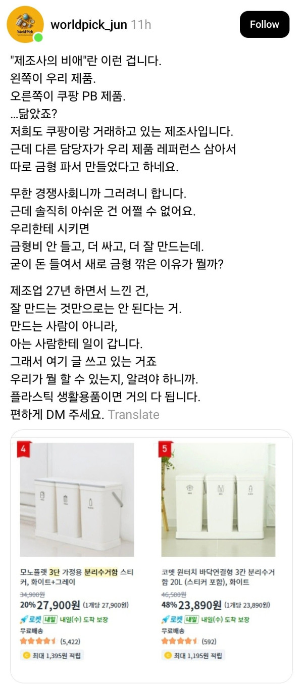 쿠팡 PB 상품, 납품업체 베끼기 근황 작성자 정보 야부야부리 작성 작성일 2026.03.18 12:39 컨텐츠 정보 355 조회 목록 본문 쿠팡 PB 상품, 납품업체 베끼기 근황 관련자료 댓글 0 등록된 댓글이 없습니다. 로그인한 회원만 댓글 등록이 가능합니다. 목록
