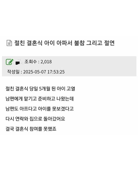 절친 결혼식 불참 뒤 절연 당함 작성자 정보 GG요 작성 작성일 2026.04.01 12:50 컨텐츠 정보 204 조회 목록 본문 절친 결혼식 불참 뒤 절연 당함 관련자료 댓글 0 등록된 댓글이 없습니다. 로그인한 회원만 댓글 등록이 가능합니다. 목록