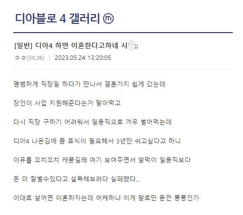 와이프에게 디아4 한다니까 이혼하자고 한다면서 자기가 퐁퐁남이냐는 디씨인 작성자 정보 GG요 작성 작성일 2026.04.02 12:22 컨텐츠 정보 302 조회 목록 본문 와이프에게 디아4 한다니까 이혼하자고 한다면서 자기가 퐁퐁남이냐는 디씨인 관련자료 댓글 0 등록된 댓글이 없습니다. 로그인한 회원만 댓글 등록이 가능합니다. 목록