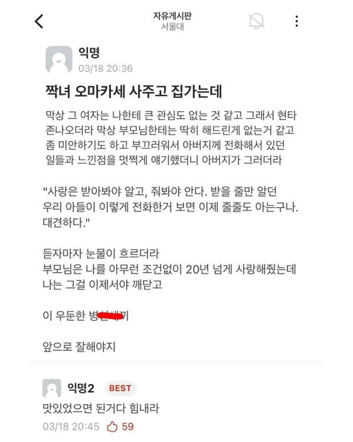 짝녀에게 오마카세 사주고 깨달음을 얻은 서울대생 작성자 정보 GG요 작성 작성일 2026.04.03 12:18 컨텐츠 정보 339 조회 목록 본문 짝녀에게 오마카세 사주고 깨달음을 얻은 서울대생 관련자료 댓글 0 등록된 댓글이 없습니다. 로그인한 회원만 댓글 등록이 가능합니다. 목록