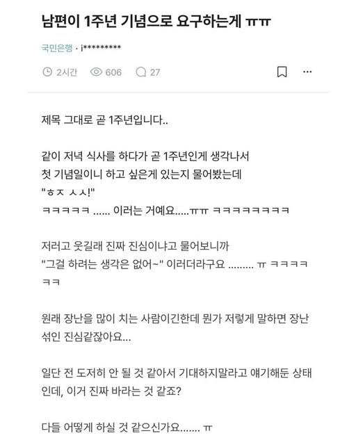 남편이 결혼 1주년 기념으로 장난스레 요구한 것 작성자 정보 GG요 작성 작성일 2026.04.11 12:25 컨텐츠 정보 3,809 조회 목록 본문 남편이 결혼 1주년 기념으로 장난스레 요구한 것 관련자료 댓글 0 등록된 댓글이 없습니다. 로그인한 회원만 댓글 등록이 가능합니다. 목록