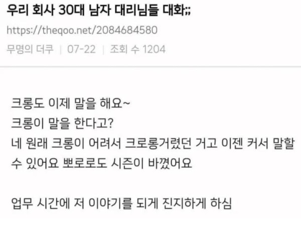 30대의 평범한 대화 작성자 정보 GG요 작성 작성일 2026.04.11 12:26 컨텐츠 정보 3,410 조회 목록 본문 30대의 평범한 대화 관련자료 댓글 0 등록된 댓글이 없습니다. 로그인한 회원만 댓글 등록이 가능합니다. 목록
