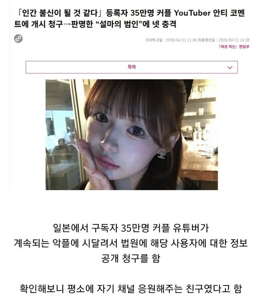 일본 35만 커플 유튜버가 악플러 고소한 결과 작성자 정보 GG요 작성 작성일 2026.04.13 12:45 컨텐츠 정보 204 조회 목록 본문 일본 35만 커플 유튜버가 악플러 고소한 결과 관련자료 댓글 0 등록된 댓글이 없습니다. 로그인한 회원만 댓글 등록이 가능합니다. 목록