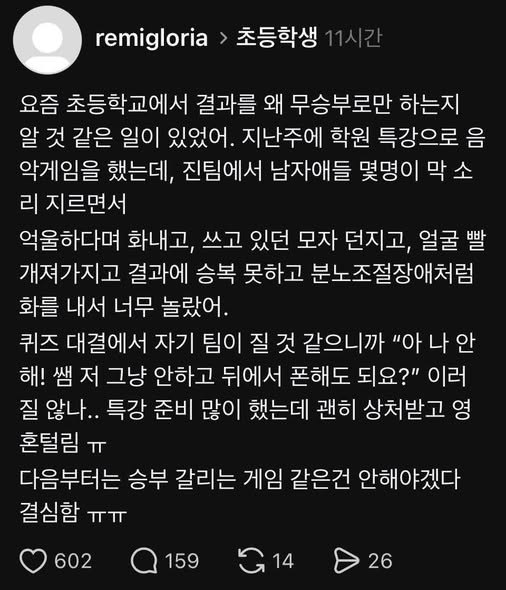 요즘 초등학교에서 결과를 무승부로 하는 이유 작성자 정보 GG요 작성 작성일 2026.04.23 12:27 컨텐츠 정보 320 조회 목록 본문 요즘 초등학교에서 결과를 무승부로 하는 이유 관련자료 댓글 0 등록된 댓글이 없습니다. 로그인한 회원만 댓글 등록이 가능합니다. 목록