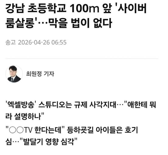 엑셀방송이 별로인 건 알겠는데 그걸 왜 초등학교 근처에서 못 하게 막아야함? 작성자 정보 GG요 작성 작성일 2026.04.27 13:07 컨텐츠 정보 268 조회 목록 본문 엑셀방송이 별로인 건 알겠는데 그걸 왜 초등학교 근처에서 못 하게 막아야함? 관련자료 댓글 0 등록된 댓글이 없습니다. 로그인한 회원만 댓글 등록이 가능합니다. 목록