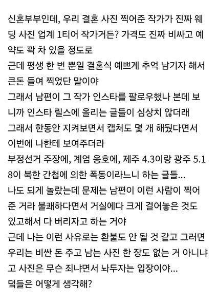 결혼사진을 찍어준 유명 사진가가 극우성향임을 알게되자 사진을 죄다 버리자는 남편 작성자 정보 GG요 작성 작성일 2026.04.27 13:08 컨텐츠 정보 231 조회 목록 본문 결혼사진을 찍어준 유명 사진가가 극우성향임을 알게되자 사진을 죄다 버리자는 남편 관련자료 댓글 0 등록된 댓글이 없습니다. 로그인한 회원만 댓글 등록이 가능합니다. 목록