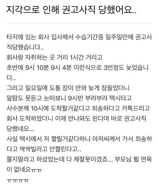 지각해서 권고사직 당했다는 사람 작성자 정보 GG요 작성 작성일 2026.04.27 13:09 컨텐츠 정보 261 조회 목록 본문 지각해서 권고사직 당했다는 사람 관련자료 댓글 0 등록된 댓글이 없습니다. 로그인한 회원만 댓글 등록이 가능합니다. 목록