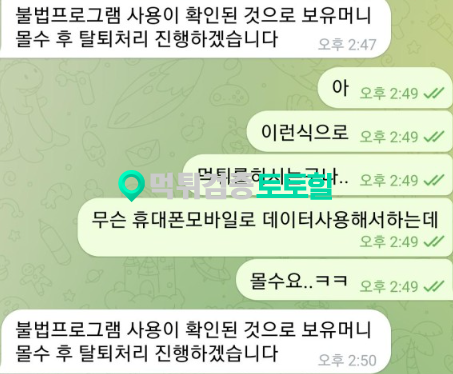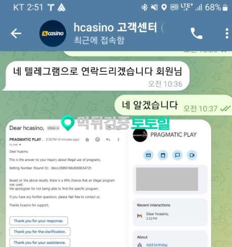 소액(100~600)정도는 환전 문제없이 잘해주다가 천단위 환전신청하니 프라그마틱본사쪽에 배팅검수요청했다고 기다리라는 답변만 계속 오다가 결국 제가 불법프로그램사용해서 작업배팅했다고 전액몰수 및 탈퇴처리 해버렸습니다. 가입연결 시켜주는 보증사(깐부슬롯) 쪽은 사이트측 처럼 메일증거사진 보내달라고 불법프로그램사용자는 보증못해준다고 발뺌합니다.