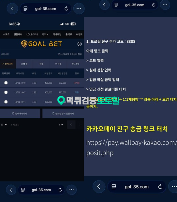 제가 그전에 문자로 홍보하는 사이트에게 먹튀를 좀 당해봤다고 말하니 골벳 관리자라는