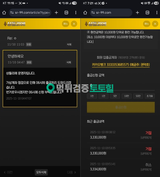 샹들리에 먹튀 작성자 정보 패스좀해라 작성 작성일 2025.11.11 12:48 컨텐츠 정보 207 조회 목록 본문 먹튀사이트 이름 샹들리에 먹튀사이트 주소 https://sr-99.com/ 피해금액 333(만)원 먹튀 증거자료 먹튀사이트 신고내용 원금 20만원도 먹하는 개씹긑은 사이트 이용하지마세요 텔레활동명 : 라이언 샹들이랑 짜고 입먹싸까지 하는 개씨발놈들입니다 라이언 말에 속아 이용절대하지마십시요 그리고 샹들리에 카는 사이트 개먹싸 씹양아치 사이트니까 절대 이용하지마십시요 샹들리에은(는) 먹튀사이트로 확인되므로 이용중단을 강력하게 권장합니다. 관련자료 댓글 0 등록된 댓글이 없습니다. 로그인한 회원만 댓글 등록이 가능합니다. 목록