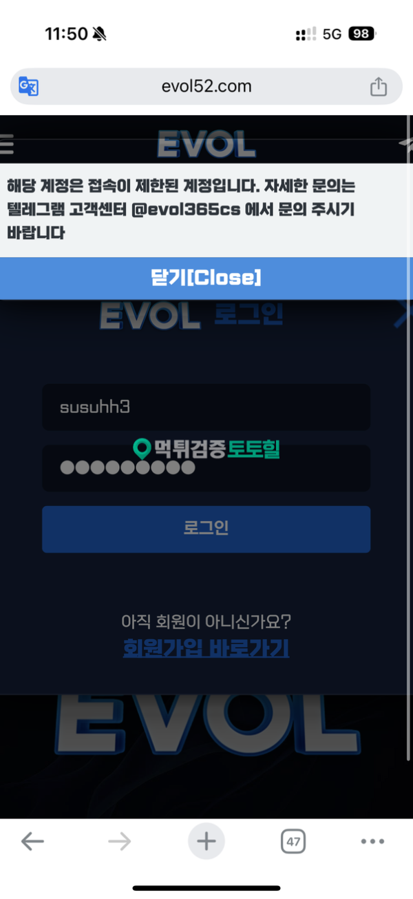 에볼 작성자 정보 고추멤멤 작성 작성일 2025.11.28 18:09 컨텐츠 정보 55 조회 1 댓글 목록 본문 먹튀사이트 이름 에볼 먹튀사이트 주소 http://evol52.com 피해금액 406(만)원 먹튀 증거자료 먹튀사이트 신고내용 에볼 중지하세요 50충해서 3폴 당첨되서 환전 누르니 바로 아이디 차단시키고 원금주고 양방드립치고 텔레 차단박네요 개그지같은사이트 당첨되면 양방이고 낙첨되면 실배터냐 당장 이용 중지하세요 ㅋㅋ 에볼은(는) 먹튀사이트로 확인되므로 이용중단을 강력하게 권장합니다. 관련자료 댓글 1 시믹현님의 댓글 시믹현 작성일 18:40 개거지 추천0비추천0 개거지 로그인한 회원만 댓글 등록이 가능합니다. 목록