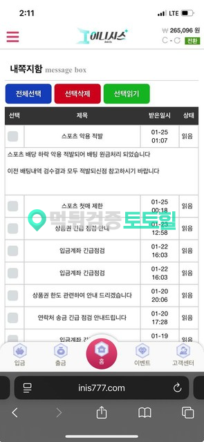 파토배너 이니시스 환전 취소하더니 당첨금 회수해가네요 배당이 이상하면 경기 시작전에 취소를 하던 원래 배당으로 처리를 하든해야지 결과처리 다 나오고 당첨되니까 쪽지 하나 띡 놓고 원금처리해가네요. 지금까지 죽은 돈 역시 아무말 없었구요. 죽으면 사이트돈 먹으면 원금처리 이제 어딜 믿고 배팅해야할지 모르겠네요 250도 안나오는거 보니 이니시스도 샤따 내릴 때 된 듯 . 다들 저처럼 피해받지 않았으면 해서 글 올려봅니다
