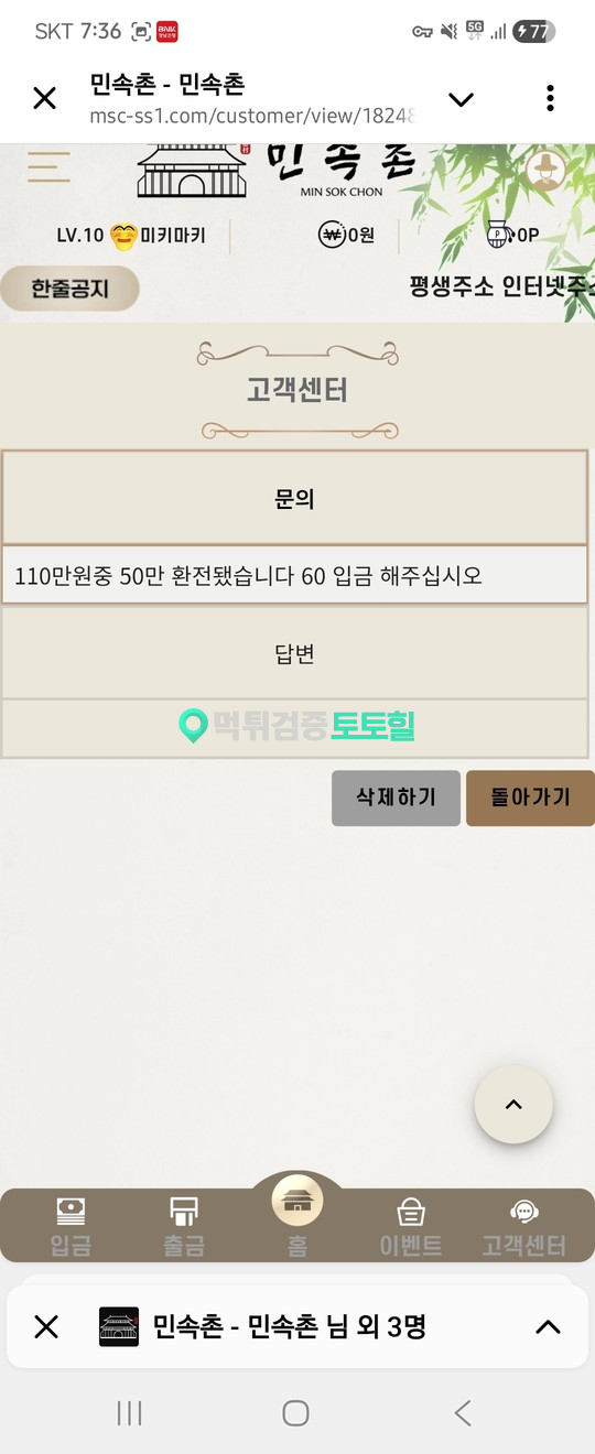 민속촌 작성자 정보 코인떡상 작성 작성일 2026.02.08 11:28 컨텐츠 정보 216 조회 목록 본문 먹튀사이트 이름 민속촌 먹튀사이트 주소 http://msc-ss1.com 피해금액 110(만)원 먹튀 증거자료 먹튀사이트 신고내용 저한테는 큰 금액인 30만원을 넣고 경기를 배팅하였는데 원금 제외 먹튀 당했습니다 처음 사용햇는데 개쓰레기 먹튀 110만원도 없는 버러지 사이트입니다 다들 조심하세요 민속촌은(는) 먹튀사이트로 확인되므로 이용중단을 강력하게 권장합니다. 관련자료 댓글 0 등록된 댓글이 없습니다. 로그인한 회원만 댓글 등록이 가능합니다. 목록