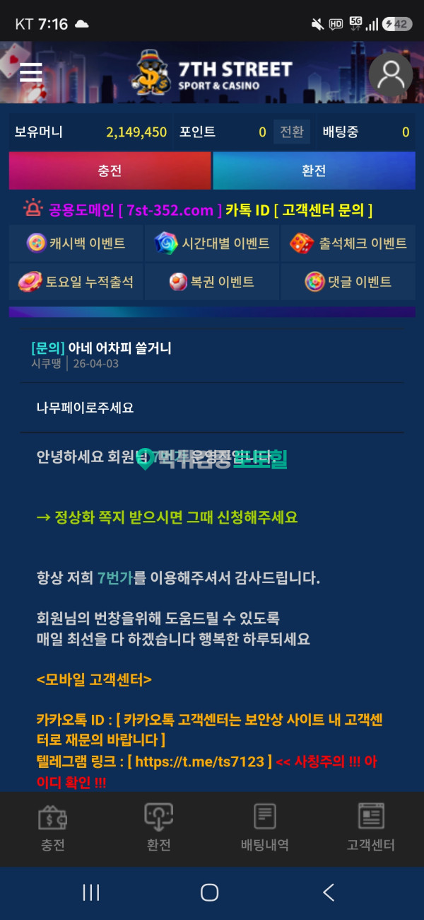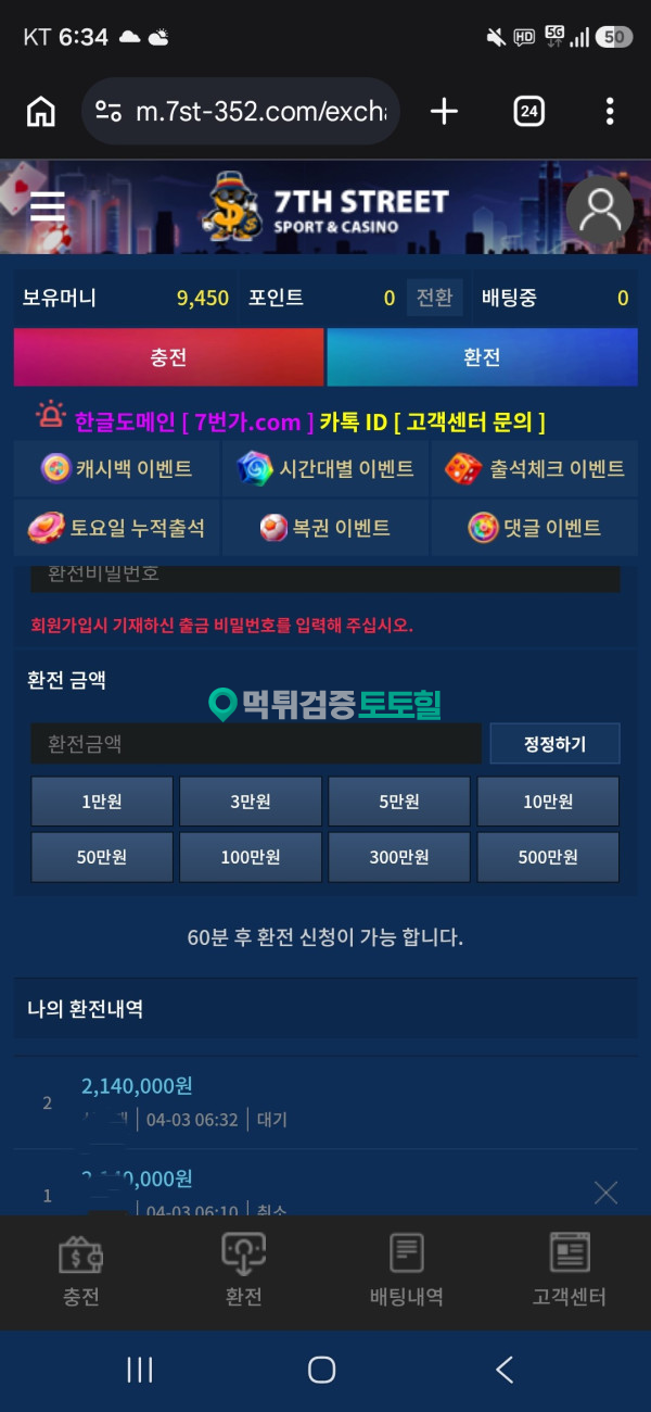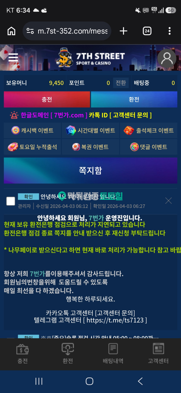 스포츠배팅을 하고 환전신청을 하니 새벽시간에 갑자기 환전업체은행 점검이라고 하더라고요