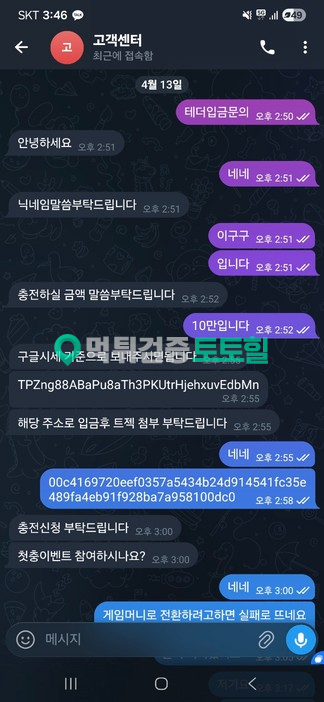 10만원충전하면 10만원 준다고해서 충전했는데 충전하자마자 돈 회수 사이트 핑계대면서 총판이 5만원을 다시 충전하면 회수한금액 넣어주겠다고 개소리 사이트는 연락도 잘안되고 총판이랑 애기하라고함 그래서 충전한다고했더니 사이트는 잠수 20시간째 그냥 먹튀사이트임 총판은 먼 보이스피싱짓거리하고있음 일반계좌도 주니깐 통협분들 많이 묶어주세요