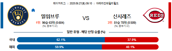 2025-09-27 09:10 MLB 밀워키 vs 신시내티