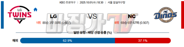 LG가 위험해지고 있다. 매직넘버 1을 2경기 연속으로 지우지 못하고 있는 중. 하지만 어빈과 김태경의 차이는 솔직히 대단히 큰 편이고 홈에서 치리노스는 충분히 호투를 기대할수 있는 레벨. 물론 전날 불펜이 공략당하긴 했으나 NC의 타선은 홈에 비해 원정의 타격이 조금 아쉽고 무엇보다 김태경은 믿기 어렵고 NC 불펜의 소모도 크다. 전력에서 앞선 LG가 승리를 가져갈 것이다.