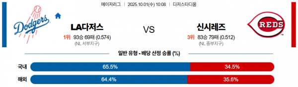 마지막의 마지막에 신시내티가 올라왔다. 기세를 이어가느냐가 관건이지만 폭발적인 기세라기보다는 메츠의 자멸이 더 컸기 때문에 솔직히 레벨이 높다는 말은 할수 없고 스넬 공략도 힘들 것이다. 신시내티 입장에선 그린이 제 몫을 해줘야 하지만 금년의 그린은 홈과 원정의 차이가 크다. 선발에서 앞선 LA 다저스가 승리를 가져갈 것이다.