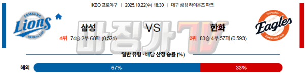 6회부터 문동주를 꺼낸 한화의 승부수는 대성공이었다. 이번 경기는 문동주와 류현진을 제외한 모든 투수를 투입할거라고 이미 공언해둔 상태. 하지만 원태인은 가을 야구 선발로서의 안정감은 후라도보다 더 우위에 있는 투수고 홈이라는 잇점도 있다. 전날 삼성의 타선은 집중력 문제를 보여주었는데 정우주의 뒤가 변수가 될듯. 일단 정우주는 제 몫을 해낼 가능성이 꽤 높은 투수라는건 부정할수 없는 부분이긴 하다. 그러나 서서히 한화의 불펜이 지쳐가고 있다는 점은 부인할수 없고 삼성의 불펜은 최대한 투수들을 아끼는 중. 그리고 이 점이 승부를 가를 것이다. 후반에 강한 삼성이 신승을 가져갈 것이다.