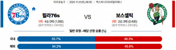 필라델피아는 워싱턴전에서 19점 차를 뒤집는 집중력을 보여주며 4연승을 이어가고 있다. 맥시가 39득점 10어시스트로 공격을 주도했고 엠비드도 제한된 출전 속에서 꾸준히 득점했다. 우브레와 신인 엣지콤까지 득점 분산이 잘 이뤄지며 팀 밸런스가 안정됐다. 반면, 보스턴은 브라운과 화이트를 중심으로 반등했지만 테이텀의 장기 결장으로 인한 공격 루트 제약이 있고 다음날 홈에서 휴스턴을 만나는 일정을 위해서 힘을 분산해야 한다. 엎친데 덮친 격 이다.