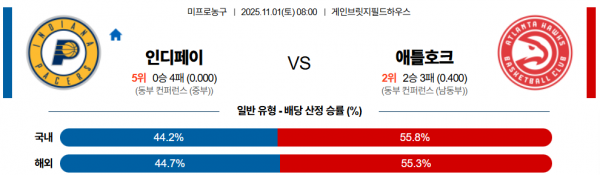 다음날 홈에서 골든스테이를 만나는 일정을 위해서 힘을 분산해야 하는 인디애나는 에이스 포함 핵심 자원 5명이 빠진 공백 속에서 4연패에 빠져 있고, 최근 경기에서도 야투 성공률이 35% 이하로 떨어지며 공격 효율이 크게 저하됐다. 시아캄이 분전하고 워커가 성장세를 보였지만 득점 루트가 제한적이다. 반면 ,애틀랜타는 브루클린전에서 트레이 영의 조기 교체 악재에도 제일런 존슨과 알렉산더 워커가 중심을 잡으며 승리했다. 골밑 수비 안정과 세컨 유닛의 득점 분배가 인상적이다.