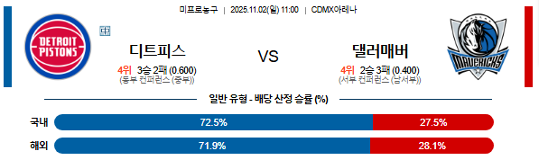 2025-11-02 11:00 NBA 디트로이트 피스톤스 vs 댈러스 매버릭스