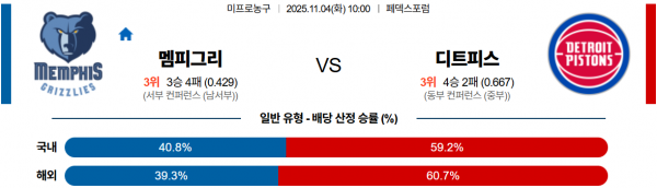 디트로이트는 최근 2연승과 함께 5경기 4승1패의 상승세를 이어가고 있다. 커닝햄이 경기 조율과 득점 모두에서 팀의 중심을 잡고 있고 듀런이 인사이드에서 강한 존재감을 보이며 안정적인 리바운드를 제공하고 있다. 또,한 톰슨과 로빈슨의 외곽 지원이 더해지며 공격 밸런스가 완성된 모습이다. 반면, 멤피스는 자 모란트의 징계 결장과 잭슨의 득점 의존도가 높아 공격 전개가 단조롭고, 리바운드 싸움에서도 밀리는 경향이 뚜렷하다.