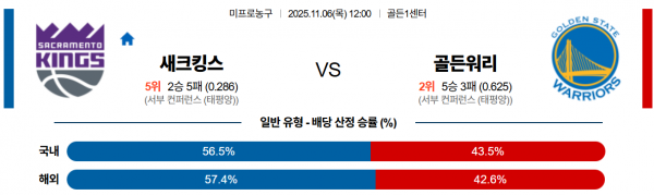 새크라멘토는 직전경기(11/4) 원정에서 덴버 상대로 124-130 패배를 기록했으며 이전경기(11/2) 원정에서 밀워키 상대로 135-133 승리를 기록했다. 최근 5경기 1승4패 흐름 속에 리바운드 47-40, 3점슛 9-12, 턴오버 15-7의 결과. 러셀 웨스트브룩이 친정팀을 상대로 26득점 12리바운드로 분전했지만, 잭 라빈(15득점)의 애투 효율성이 떨어졌던 경기. 7명의 선수가 두 자릿수 득점을 기록한 공격은 나쁘지 않았지만 수비 로테이션이 흔들리며 니콜라 요키치의 패스 플레이에 효과적으로 대응하지 못했고, 외곽 수비와 리바운드 집중력에서도 열세를 보였던 상황. 정규시즌 홈경기에서는 1승1패 성적.