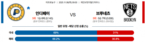 인디애나는 밀워키전에서 아쉽게 패했지만 파스칼 시아캄과 아이재아 잭슨이 중심을 잡으며 공격 밸런스를 회복했다. 주전들의 부상 공백이 있었으나 홈에서의 경기력은 점차 안정세를 찾고 있다. 반면, 브루클린은 7연패 수렁에 빠지며 수비 조직력이 완전히 무너졌다. 외곽 수비 허점과 턴오버가 반복되고 있으며 원정 3연패로 경기력 하락이 뚜렷하다. 홈에서 집중력을 끌어올릴 인디애나가 브루클린을 상대로 승리할 가능성이 높다.