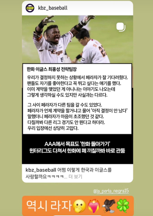 그런데 최근의 페라자 행보를 보면 너무 요란스럽다. 그토록 다시 오고 싶었던 KBO 복귀가 성사됐으니 기뻐서 그럴 수도 있다. 하지만 그는 매일 자신의 SNS에 한화 재입단과 관련한 사진 및 영상들을 올리고 있다. 심지어 한국어로 된 계약 비하인드 스트리까지 게재했다.