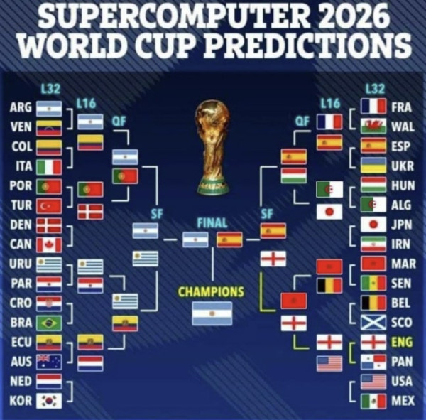 우승의 주인공은 아르헨티나였다. 아르헨티나는 8강에서 크리스티아누 호날두의 포르투갈을 꺾고, 4강에서 잉글랜드를 물리치고 결승에 오를 것이라고 봤다. 아르헨티나의 상대는 라민 야말의 스페인, 하지만 결국 메시가 월드컵 2연패에 성공할 것이라고 AI는 분석했다.