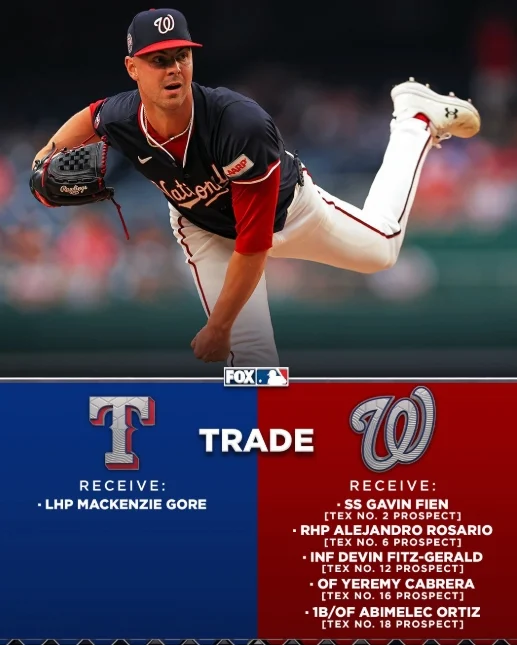 미국 매체 디애슬레틱은 23일(한국시간) 워싱턴이 텍사스 레인저스와 트레이드를 통해 좌완 선발 맥켄지 고어를 보내고, 유망주 5명을 받는 데 합의했다고 전했다. 이어 텍사스 구단이 트레이드를 공식 발표했다.