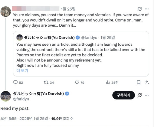 "넌 퇴물이야. 추하니까 은퇴해" 악성 메시지에, 다르빗슈 직접 답했다